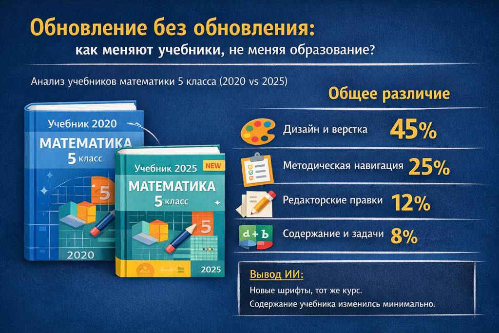 За пять лет между изданиями учебника математики для 5 класса (2020 → 2025) внешне произошло заметное «обновление»: новая верстка, более современная графика, аккуратная навигация, QR-доступ к дополнительным материалам, визуально более чистая подача. Создаётся впечатление серьёзной модернизации.
