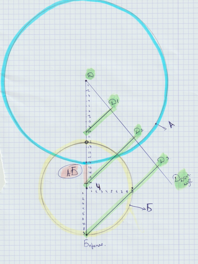 А теперь — самое интересное: попробуйте, глядя на следующее изображение, понять, как можно найти решение без вычислений; только ручка, циркуль, линейка, треугольник и тетрадь в клеточку, ну и маркеры для красоты.