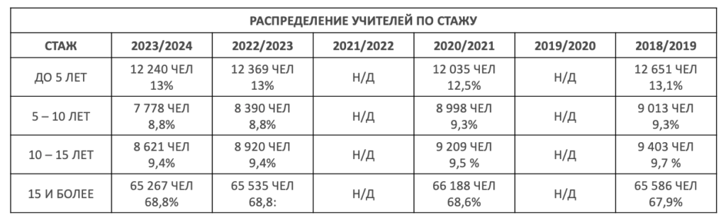 Если посмотреть на эти данные, возникает ощущение, что система образования не развивается, а «законсервировала саму себя». Распределение учителей по стажу почти не меняется год за годом: те же доли в группах; а колебания — в пределах десятых долей процента. Вместо обновления — сохранение старой конфигурации. Формально — стабильность. По сути — «законсервированное старение».
